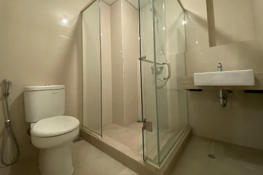 Unit kosongan, hanya disediakan AC dan top table untuk kitchen dan sink. Toilet sudah lengkap tanpa kaca.
